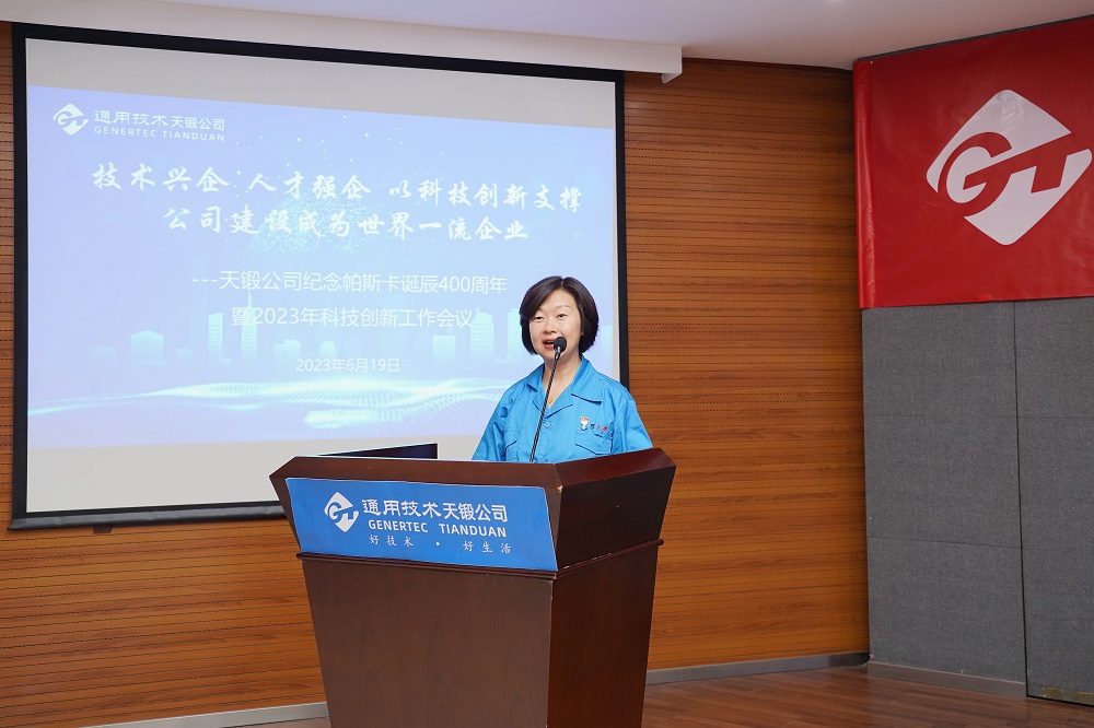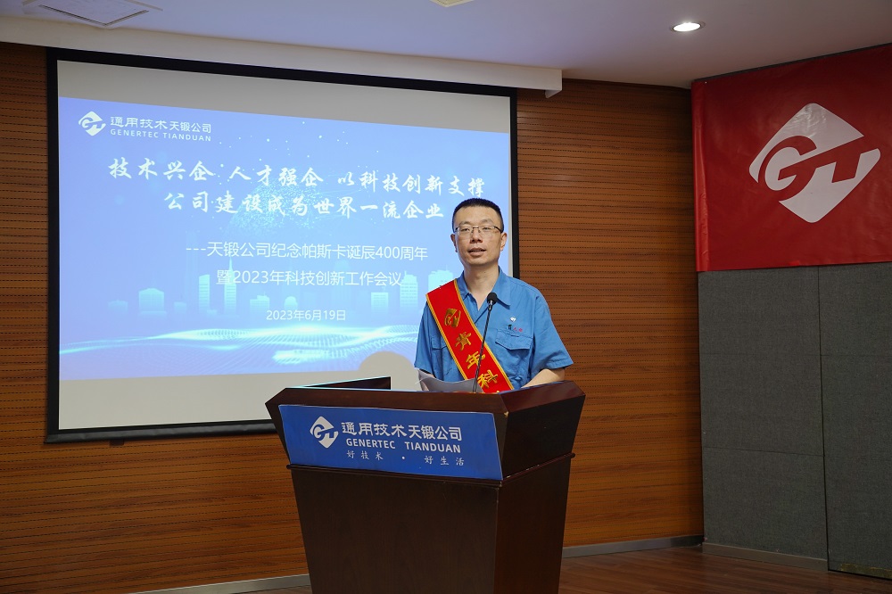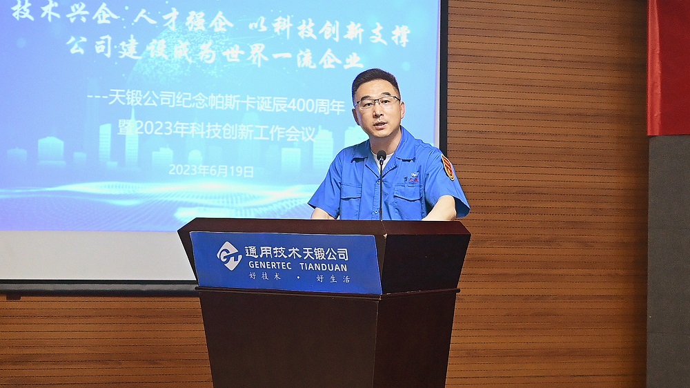2023年6月19日,時逢法國科學家布萊士·帕斯卡誕辰400周年,天鍛公司隆重召開紀念帕斯卡誕辰400周年暨2023年科技創新工作會議,會議主題是“技術興企,人才強企,以科技創新支撐公司建設成為世界一流企業”。公司領導、有關專家、科技人員代表、各單位和基層黨組織負責人共計近150人參會。