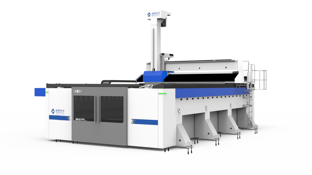該產品適用于新能源等重點領域的復雜型面的復合材料五軸聯動加工,具有高速度、高效率、高安全性、綠色環保等特點。橫梁采用高剛性加長設計,橋梁間距4700mm,通過性更好,適合大尺寸工件加工;高速電主軸銑頭為單臂式結構,采用力矩電機直驅,最高轉速20000r/min,可有效提升加工效率;直線軸均為滾柱直線導軌,全齒輪齒條傳動,最高速度可達85m/min,并配備液壓緩沖與線性制動雙重保護,安全性大幅提升;產品標配柔性護頂的全封閉式防護結構,安全環保性能優異。