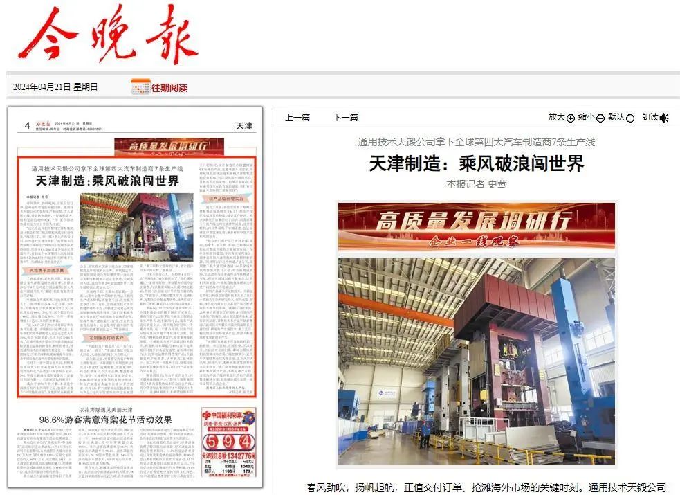 《今晚報》大版面報道了公司贏過諸多知名世界級對手,拿到全球第四大汽車制造商7條熱成形生產線訂單,乘風破浪闖世界背后的故事。